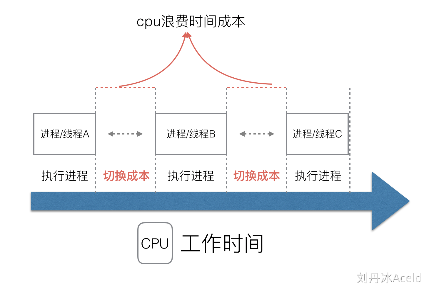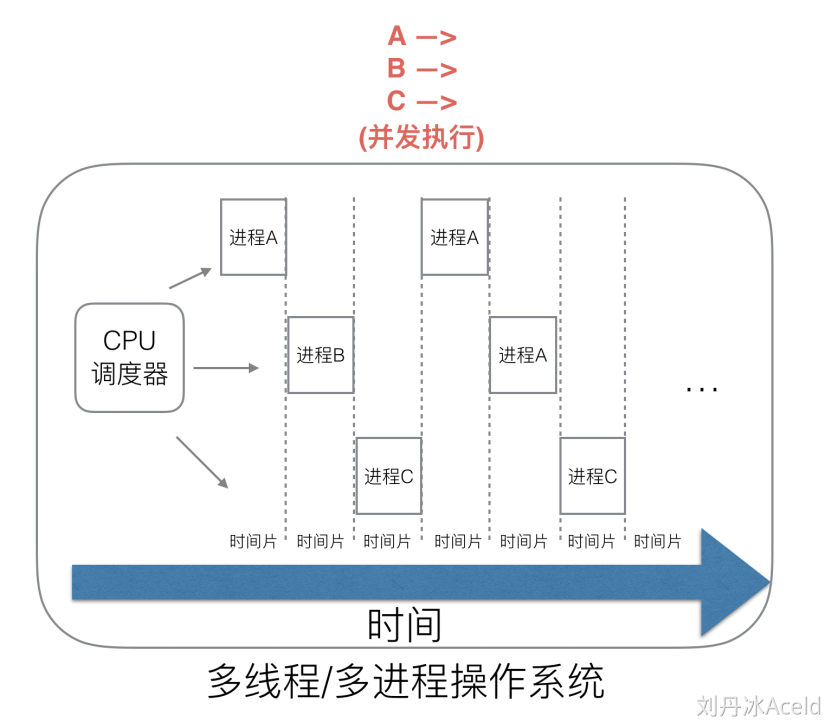 后来操作系统就具有了最早的并发能力:多进程并发,当一个进程阻塞的时候,切换到另外等待执行的进程,这样就能尽量把CPU利用起来,CPU就不浪费了。