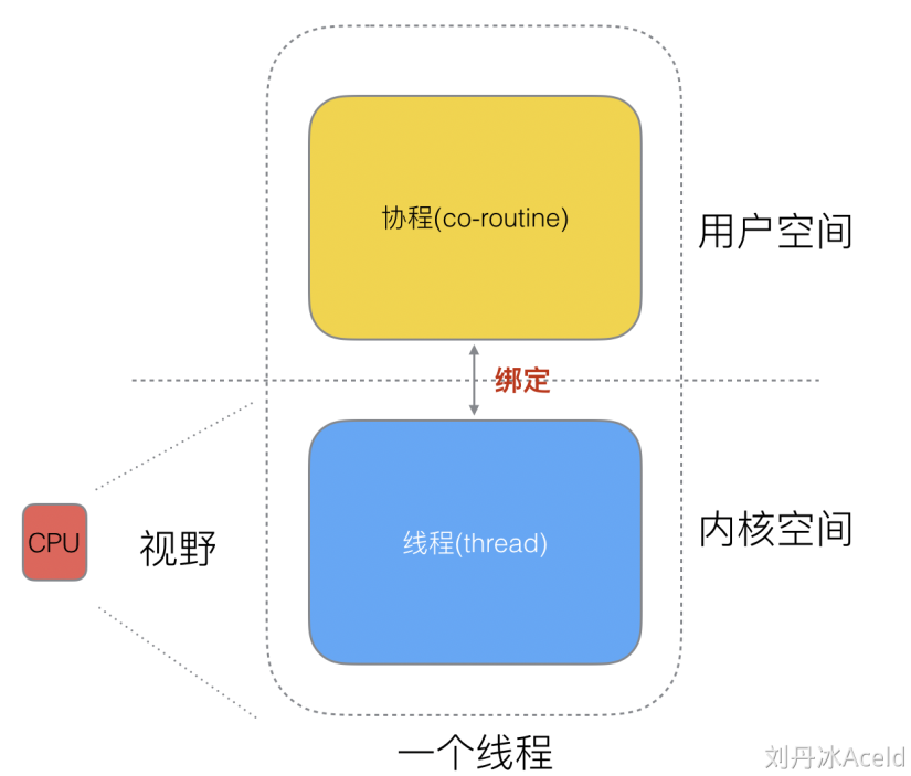 这样,我们再去细化去分类一下,内核线程依然叫“线程(thread)”,用户线程叫“协程(co-routine)".