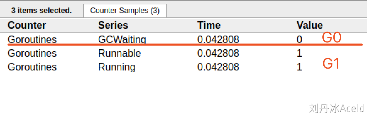 其中G1应该就是main goroutine(执行main函数的协程),在一段时间内处于可运行和运行的状态。
