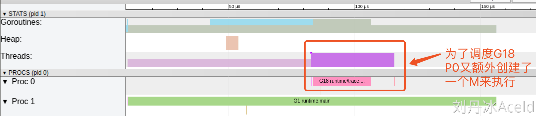 G1中调用了main.main,创建了trace goroutine g18。G1运行在P1上,G18运行在P0上。