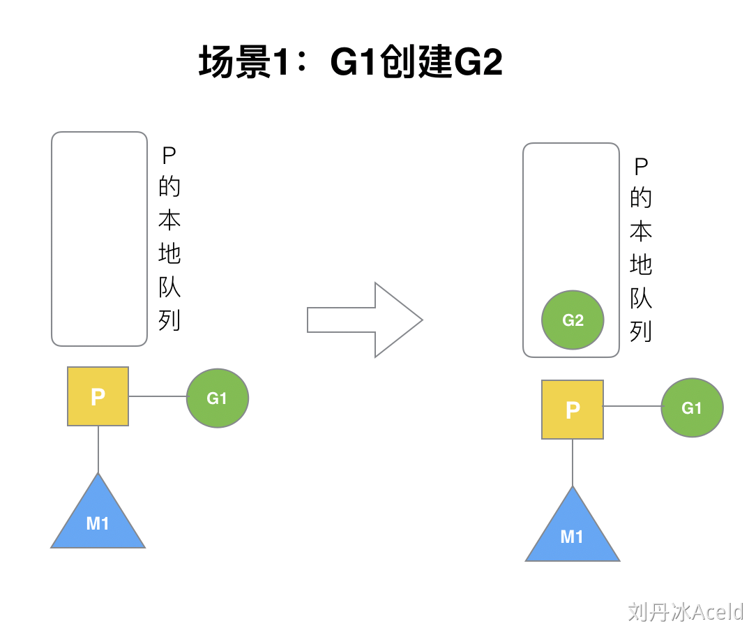 (实现中并不一定是新的G,如果G是G2之后就执行的,会被保存在本地队列,利用某个老的G替换新G加入全局队列)