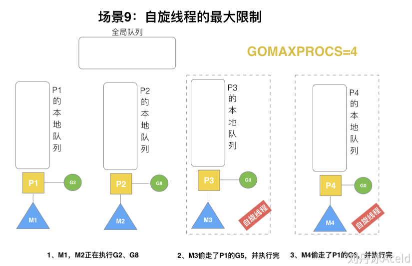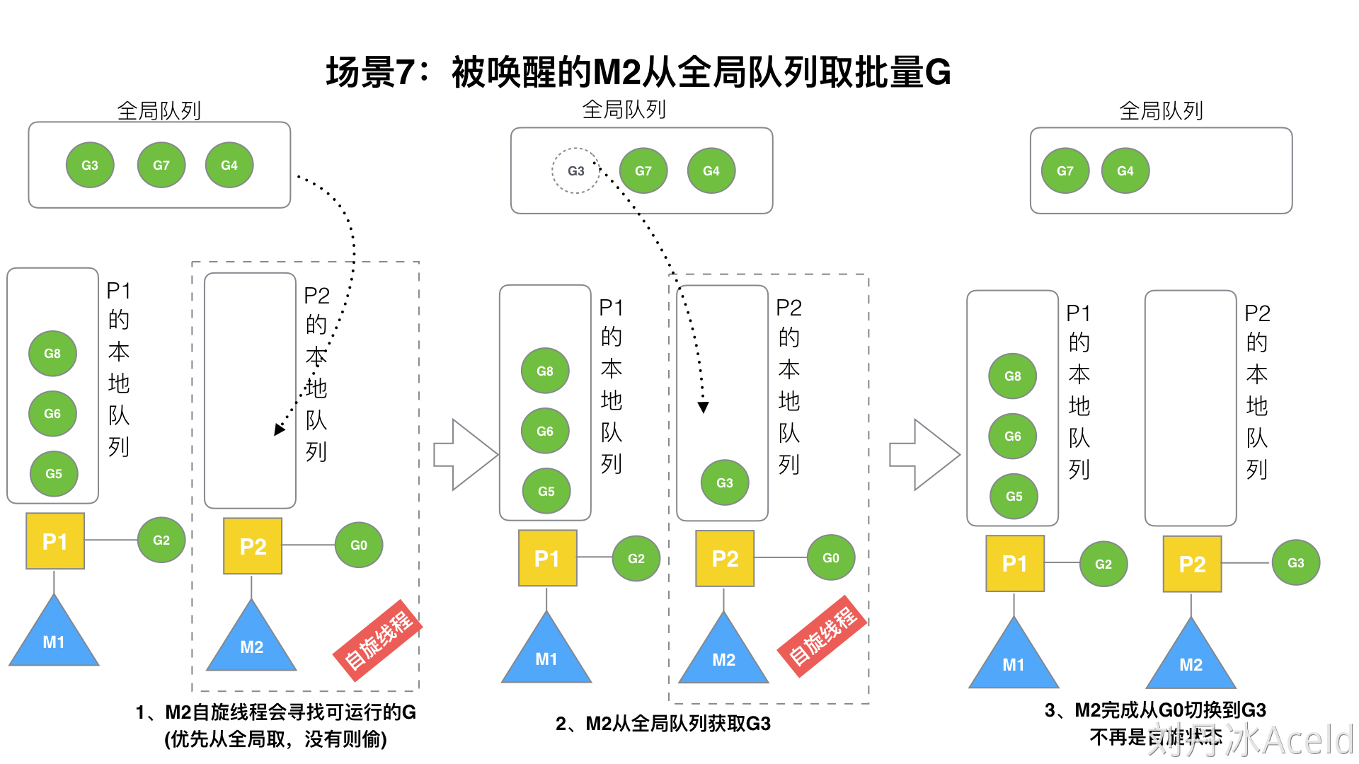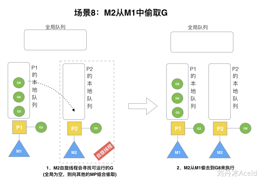 (基于场景7)假设G2一直在M1上运行,经过2轮后,M2已经把G7、G4从全局队列获取到了P2的本地队列并完成运行,全局队列和P2的本地队列都空了,如场景8图的左半部分。