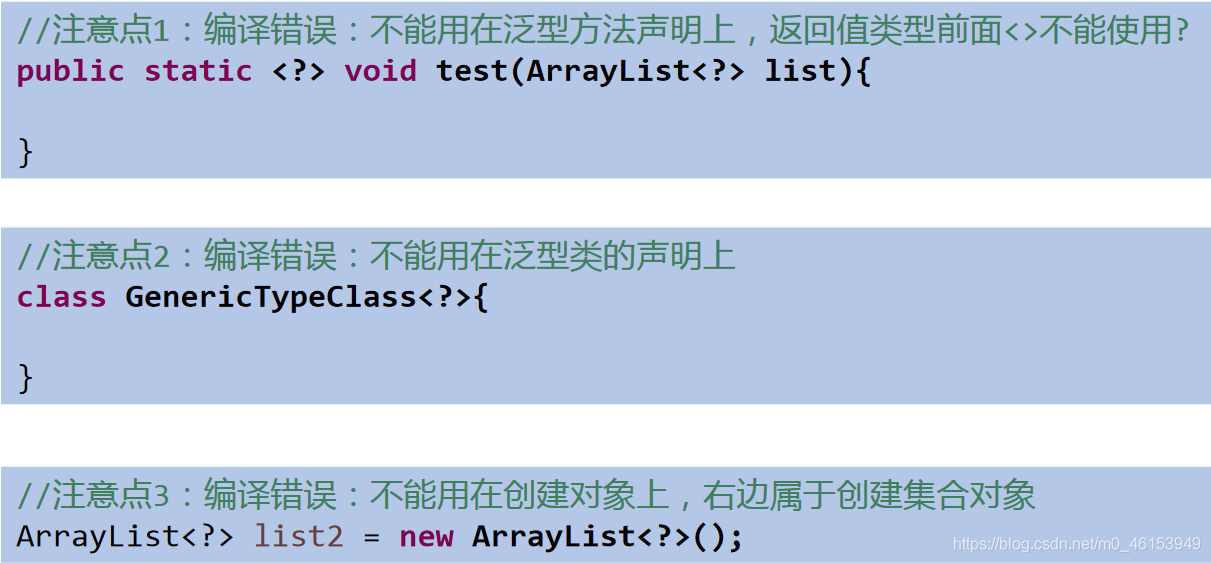 - c.add(new Object()); // 编译时错误因为我们不知道c的元素类型,我们不能向其中添加对象。add方法有类型参数E作为集合的元素类型。我们传给add的任何参数都必须是一个未知类型的子类。因为我们不知道那是什么类型,所以我们无法传任何东西进去。