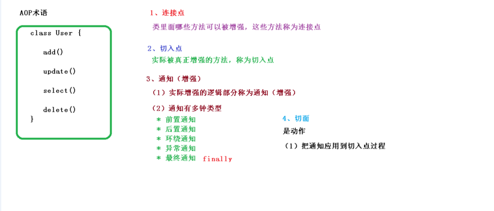 - 在增强类里面,创建方法,让不同方法代表不同通知类型