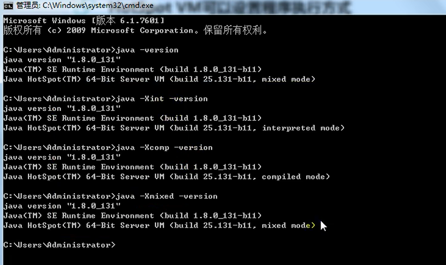 缺省情况下 HotSpot VM 是采用解释器与即时编译器并存的架构,当然开发人员可以根据具体的应用场景,通过命令显式地为 Java 虚拟机指定在运行时到底是完全采用解释器执行,还是完全采用即时编译器执行。如下所示: