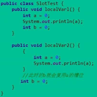 栈帧中的局部变量表中的槽位是可以重用的,如果一个局部变量过了其作用域,那么在其作用域之后申明的新的局部变就很有可能会复用过期局部变量的槽位,从而达到节省资源的目的。