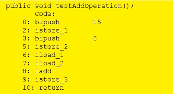 - 某些字节码指令将值压入操作数栈,其余的字节码指令将操作数取出栈。使用它们后再把结果压入栈。