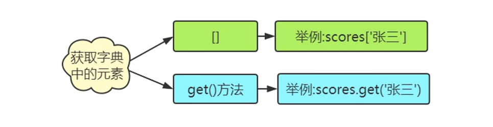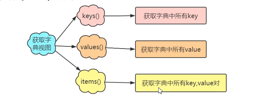 - get()方法取值,如果字典中不存在指定的key,并不会抛出keyError而是返回None,可以通过参数设置默认的value,以便指定的key不存在时返回