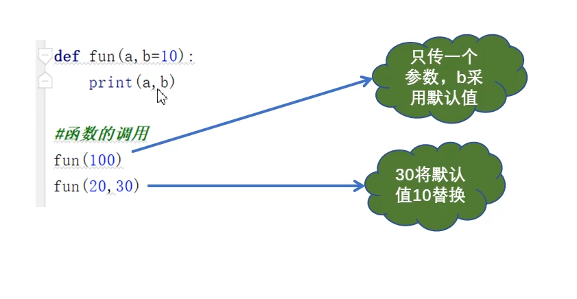 - 函数定义时,给形参设置默认值,只有默认值不符的时候才需要传递实参