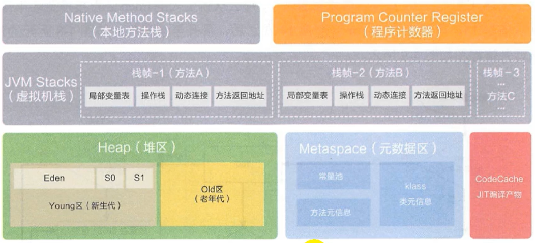 • 线程间共享:堆、堆外内存(永久代或元空间、代码缓存)