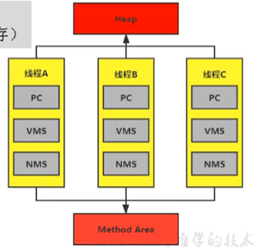 灰色的为单独线程私有的,红色的为多个线程共享的。即: