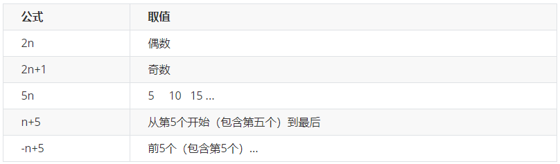 - 关于 nth-child(n) 我们要知道 n 是从 0 开始计算的,要记住常用的公式